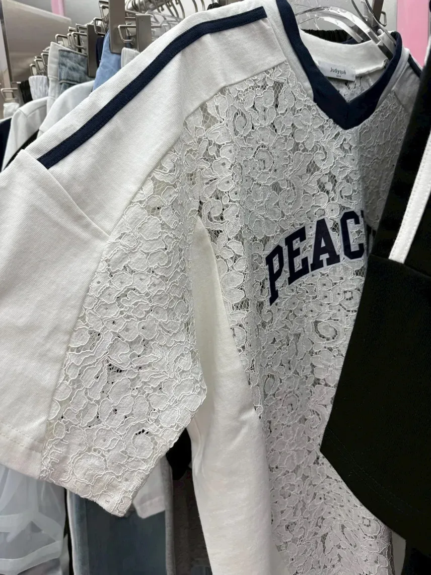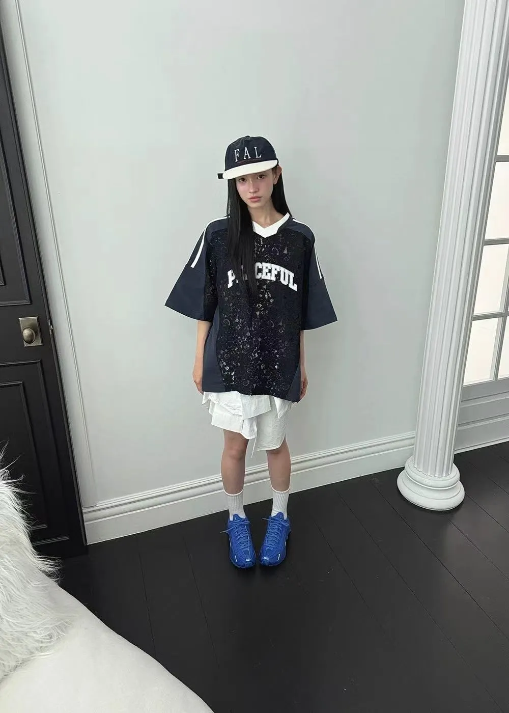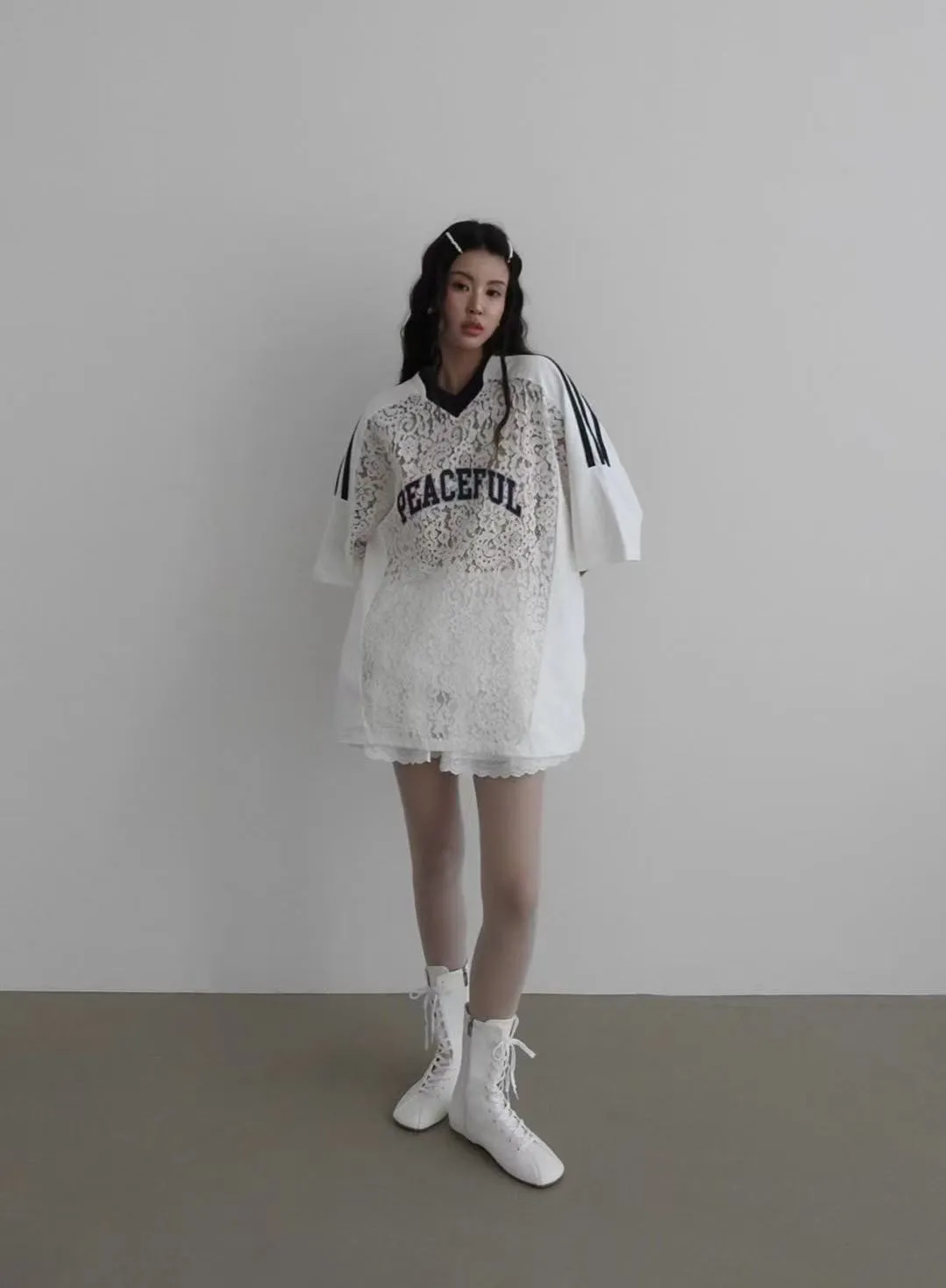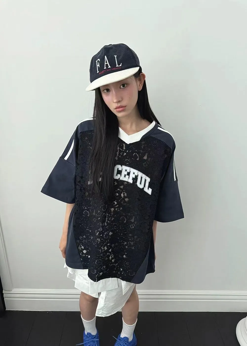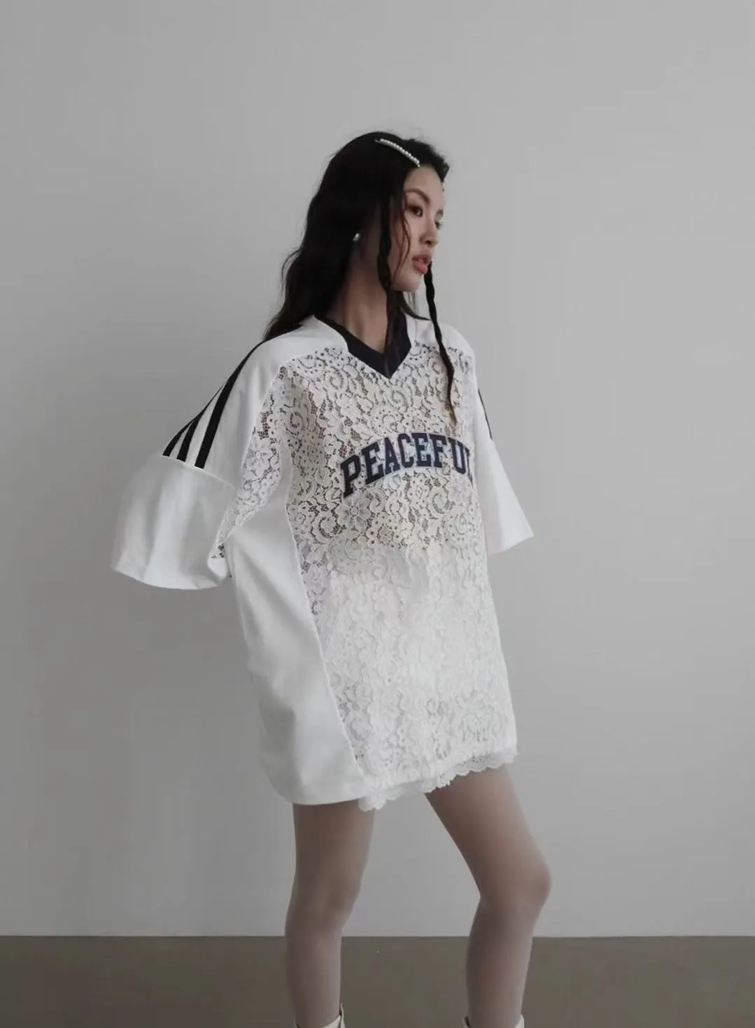 無違和甜酷混搭感-挺版蕾絲拼接球衣